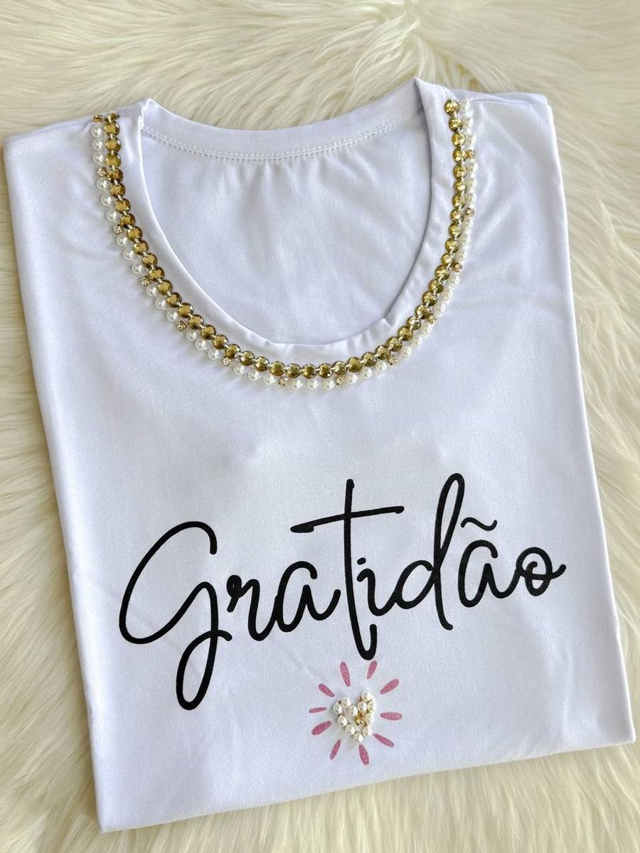 Camiseta bordada gratidão,tecido de Viscolycra.