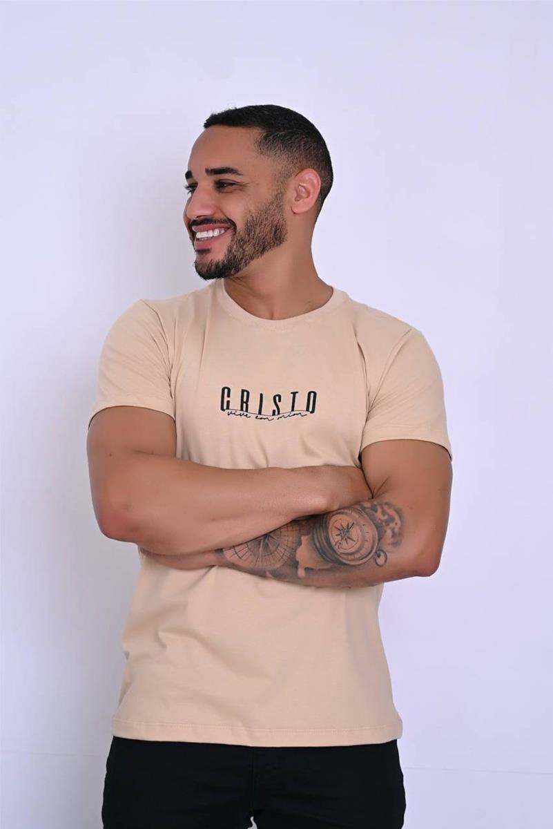 Camiseta masculina Cristo vive em mim algodão Premium, reforço ombro a ombro, Gola ribana.